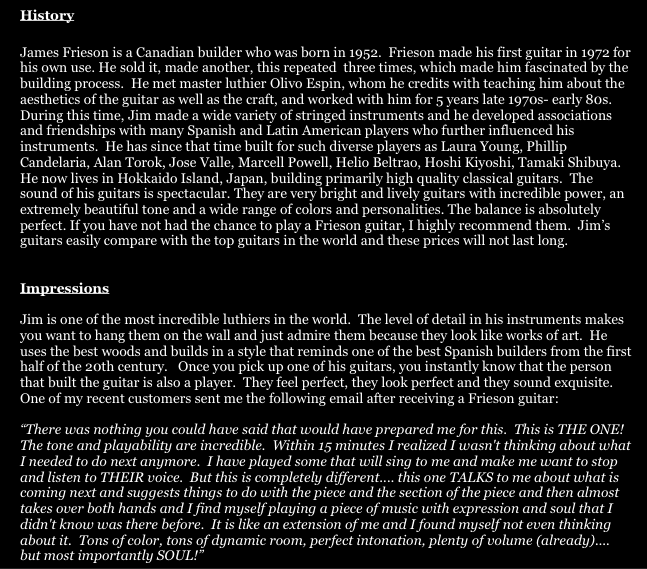 I only receive a few guitars a year from Jim and he is one of the few luthiers in the world that combine the aesthetic and sonic qualities in a fantastic blend of sound and art. I have compared his guitars to many of the top builders in the world and all I can say is that they compare very well to instruments that cost 2 to 3 times as much.